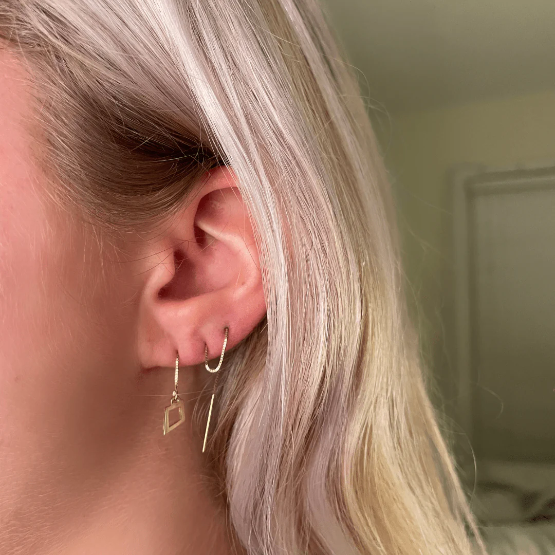 If you’re new to threaders, prepare to fall in love with the energy and twinkle they add to your look. Our beautiful Theta kite threaders are incredibly lightweight (just 0.38 grams!) and don’t require traditional earbacks, making them the most comfortable earrings we’ve ever worn.