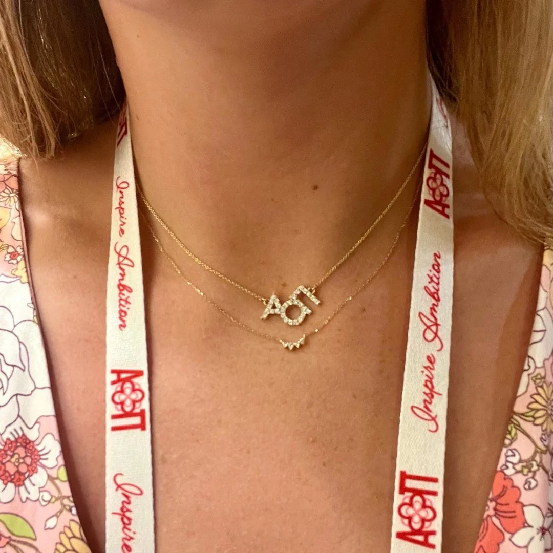 True story: our founder Lizzy, an AOII, designed this piece when she wanted something special to wear to the closing gala at the 2023 International Convention. She received so many compliments that night that she decided to add the design to the mazi + zo AOII collection and launched AOII Luxe which also includes an all-ruby AOII and a solid gold AOII necklace with a ruby at the apex of the A.