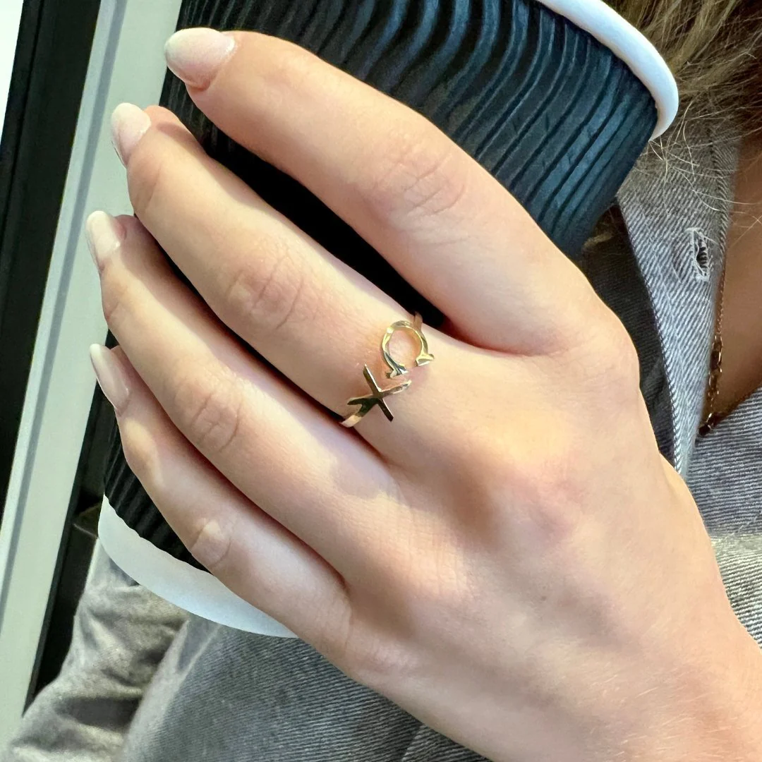 Handcrafted in NYC, our solid 14k gold Chi Omega ring is a strong 1.2mm thick all around, and the letters stand approximately 8mm tall. Our Medium fits size 6/7, and Large is available by special order. Consistent with our values, this ring is meticulously crafted from ethically sourced gold, and we offer it in sustainable sterling silver as well.
