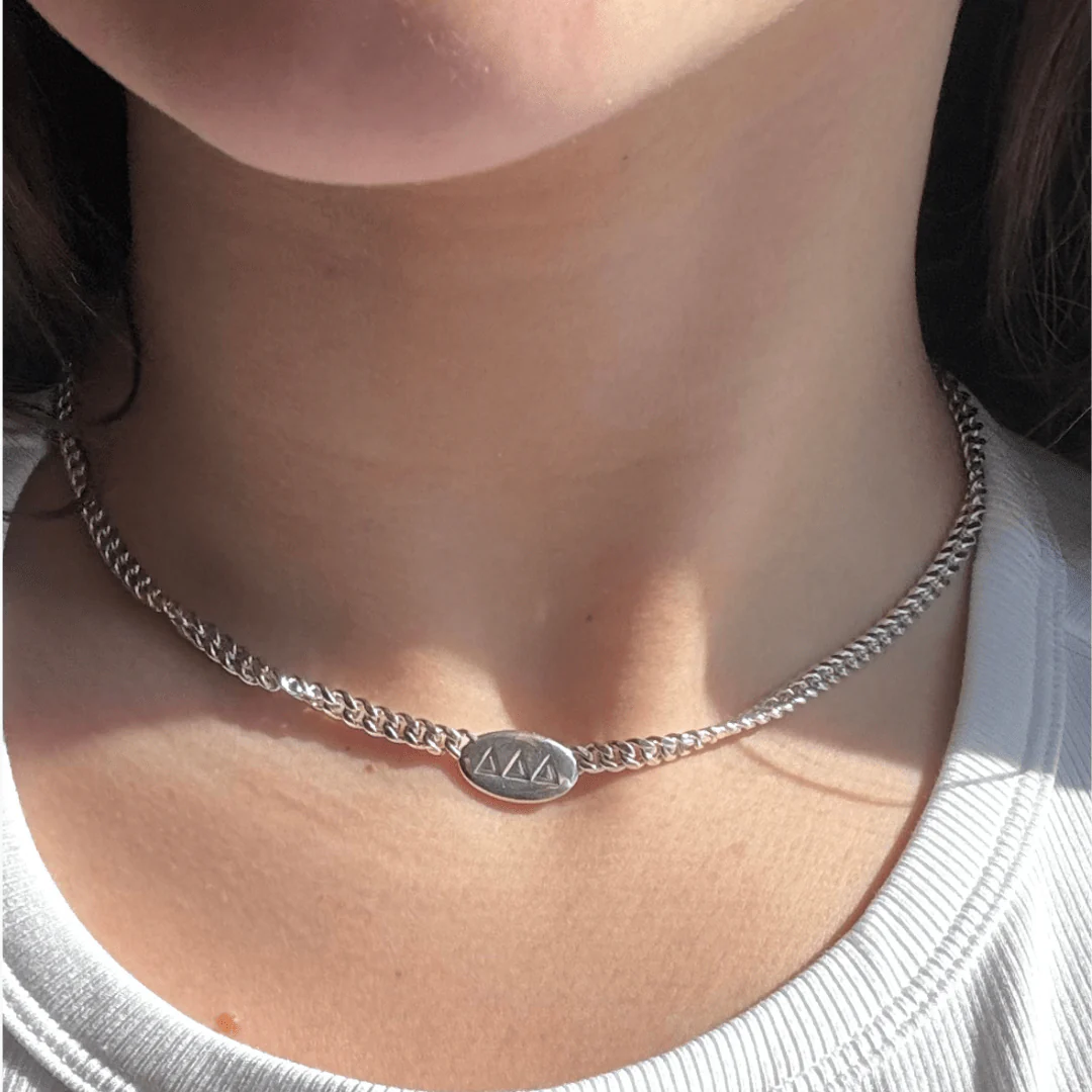 With a sleek, minimalist charm on a bold curb chain, this Tri Delta necklace adds just the right amount of shine—day or night. It’s the perfect way to celebrate Tri Delta sisterhood.