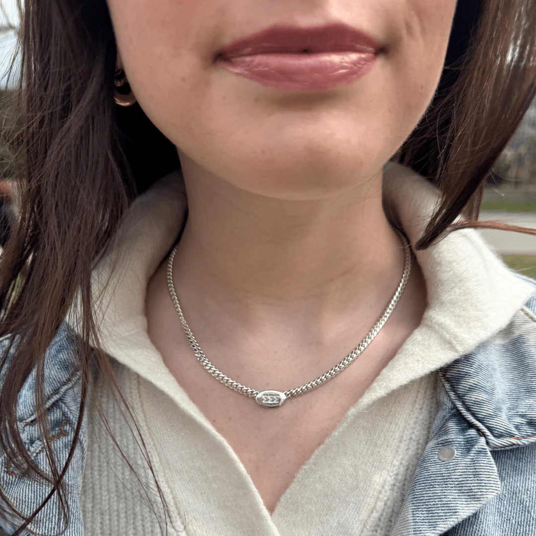 With a sleek, minimalist charm on a bold curb chain, this Tri Sigma necklace adds just the right amount of shine—day or night. It’s the perfect way to celebrate Tri Sigma sisterhood.